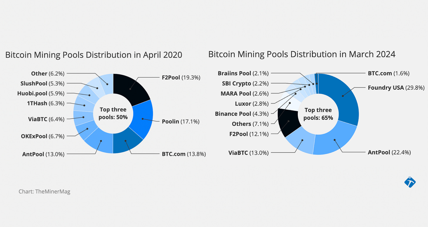 In the month before the 2020 halving, the top pools were all China-based or affiliated with exchanges that had strong user bases in China. However, the country’s toughest-ever crackdown on bitcoin mining in 2021 led to the rise of North American players. Some of the top 10 pools in March 2024 didn’t make the list in April 2020, while some others didn’t even exist.
