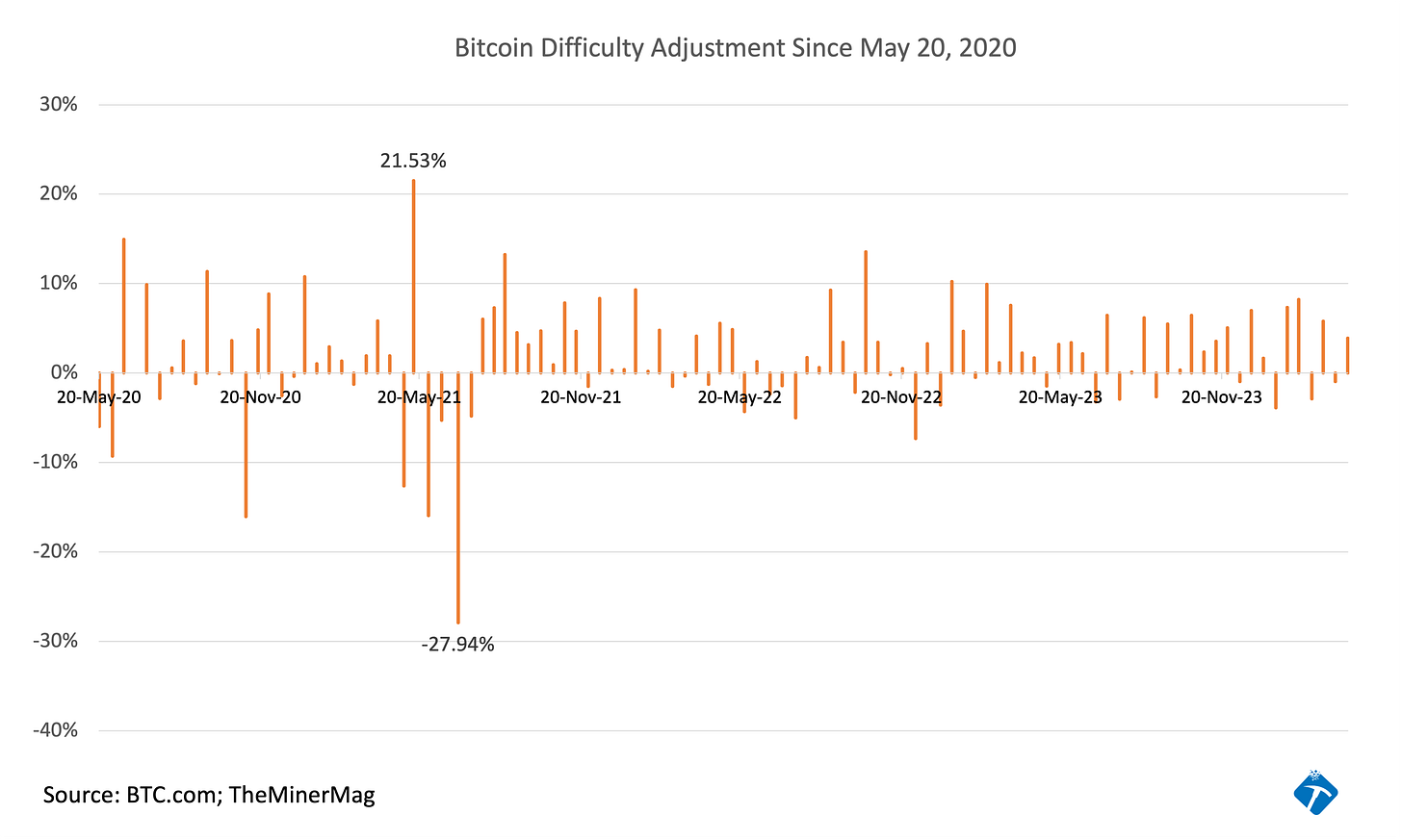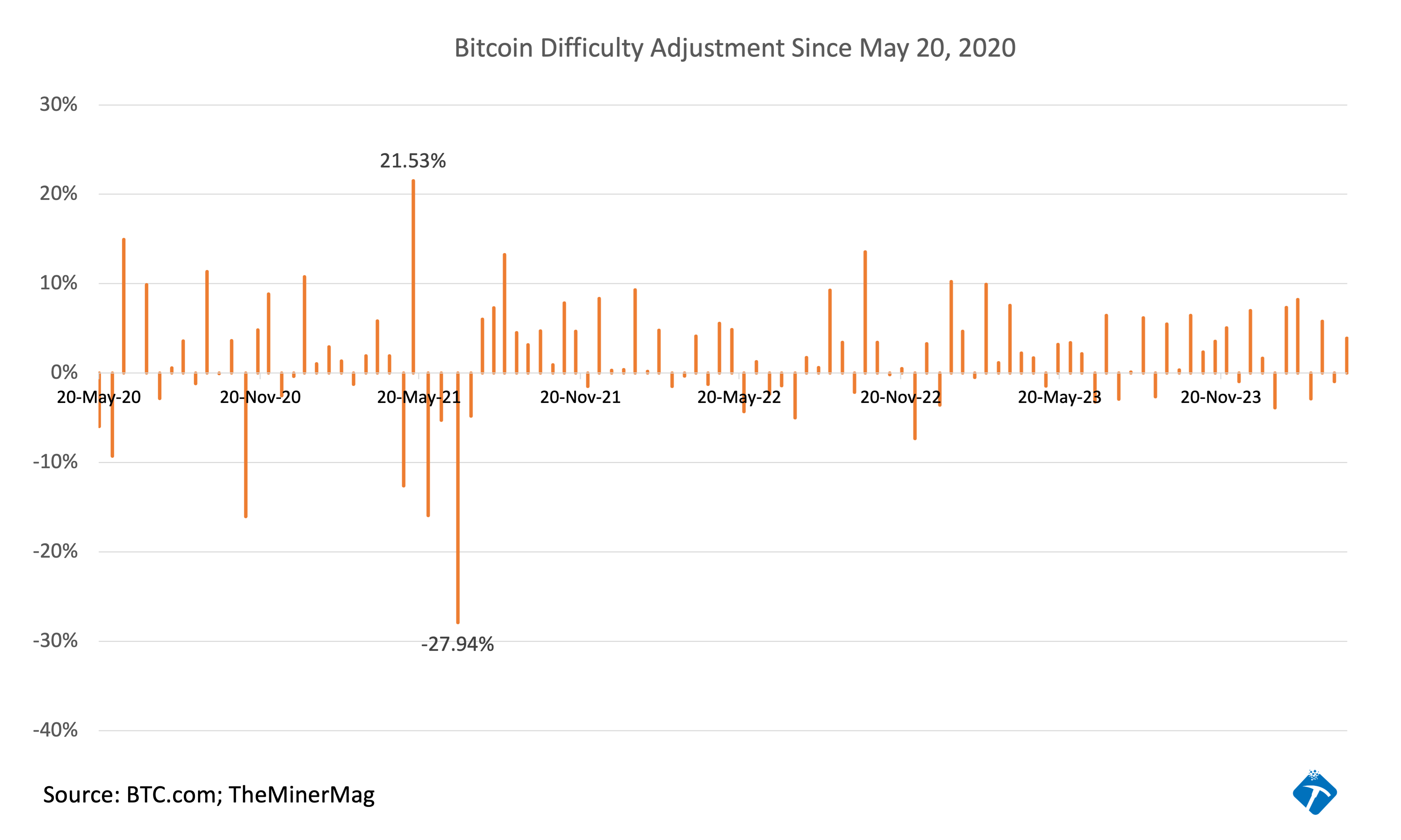 On May 5, 2020, bitcoin’s network difficulty had the last adjustment before the previous halving, reaching 16.1 trillion. On April 11, 2024, in the last adjustment before the upcoming halving, the network difficulty went up to 86.3 trillion.