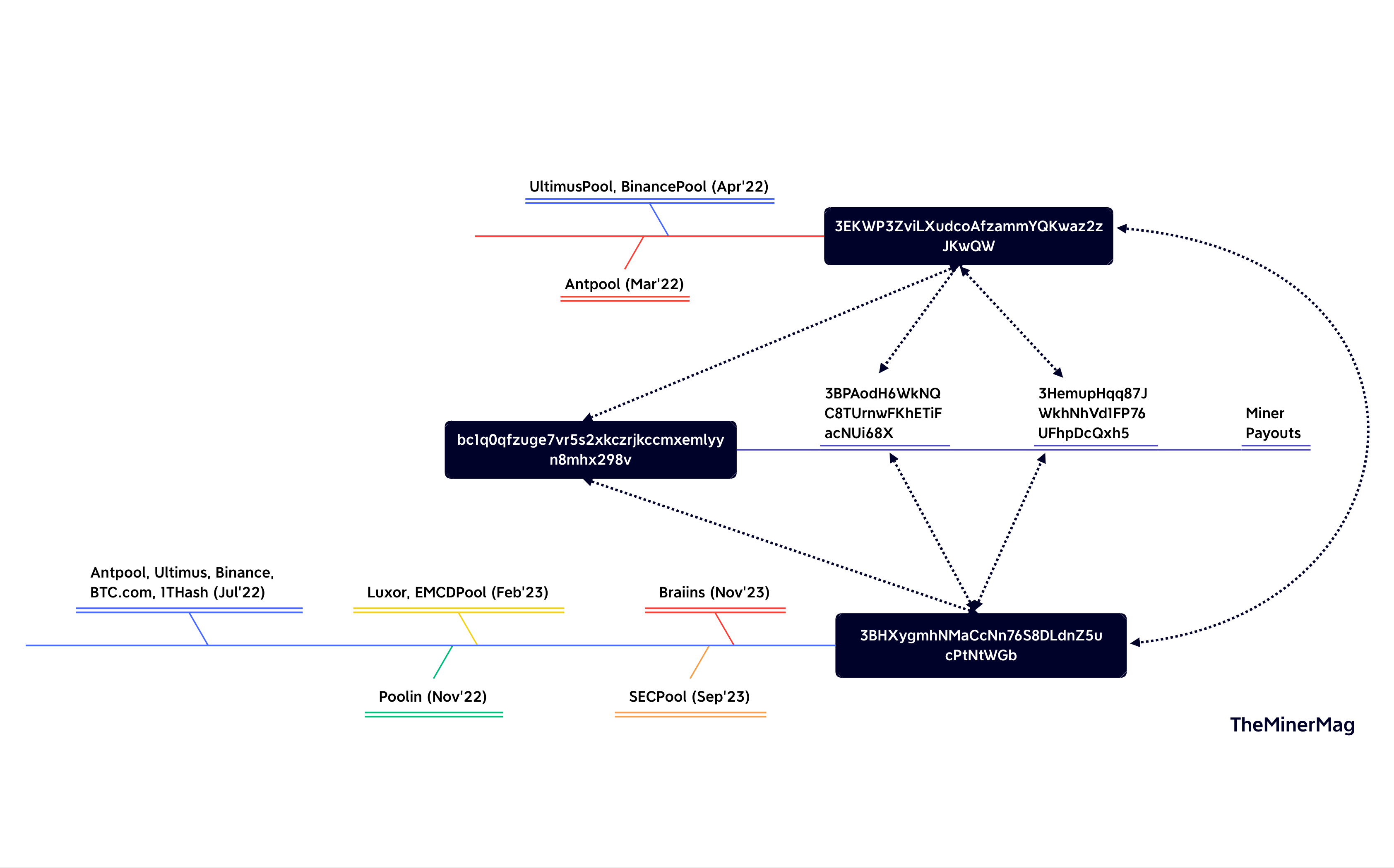 For instance, Antpool, Binance Pool, Braiins Pool, and Poolin recently sent about 100 BTC in a transaction to two output addresses. Other recent transactions exhibited similar behaviors by other pools, and this pattern could be traced back to April 2022, as mapped out in the diagram below by TheMinerMag.