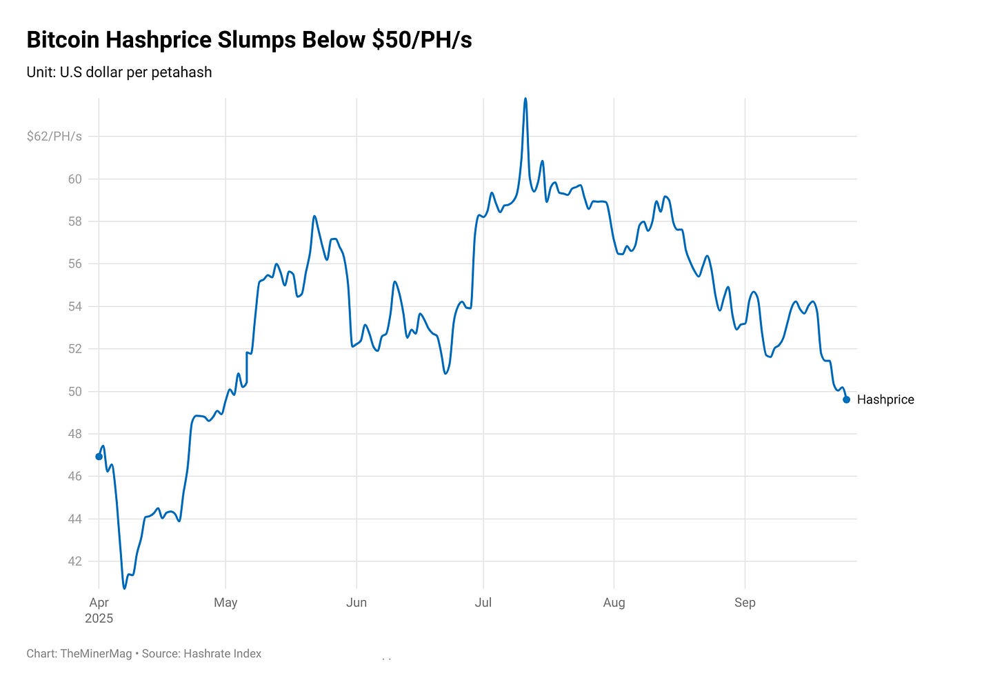 This week, hashprice — the revenue earned per petahash per second — fell below $50/PH/s for the first time since April. If current projections hold, it could soon dip below $46/PH/s, a level last seen when bitcoin was priced closer to $90,000. That contrast underscores a sharp rise in network competition that’s offsetting even historic BTC price levels.