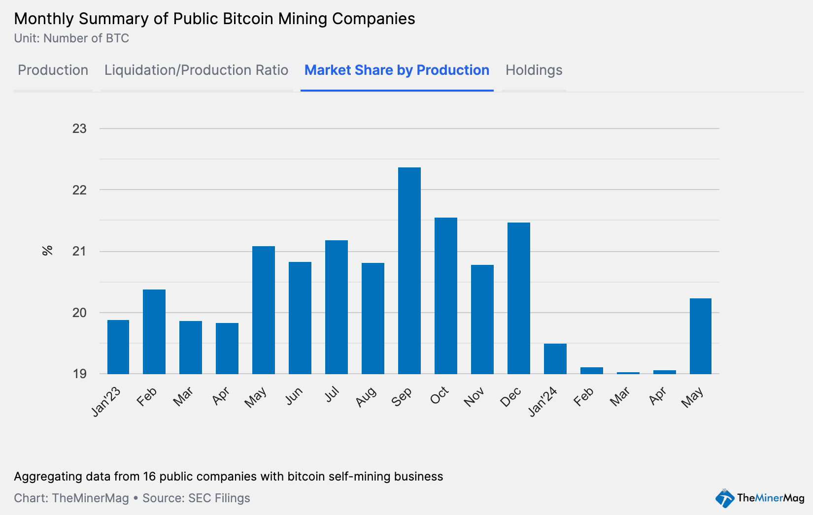 Out of the 16 public mining firms regularly tracked by TheMinerMag, 15 have released production updates for May. But even with one company missing (looking at Hut8), the remaining 15 mined 20.24% of the total block rewards available last month.