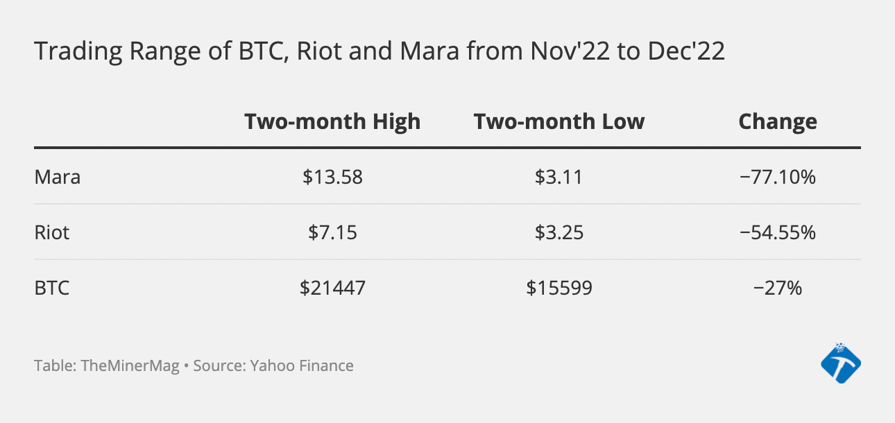 Mara reduced its revolving credit to $30 million later in November and paid it off entirely in December, likely with a new capital injection of a similar size from share dilution. Its stock price’s two-month low between November and December was down 77% from its high over the same period, much more volatile than that of Riot and BTC.
