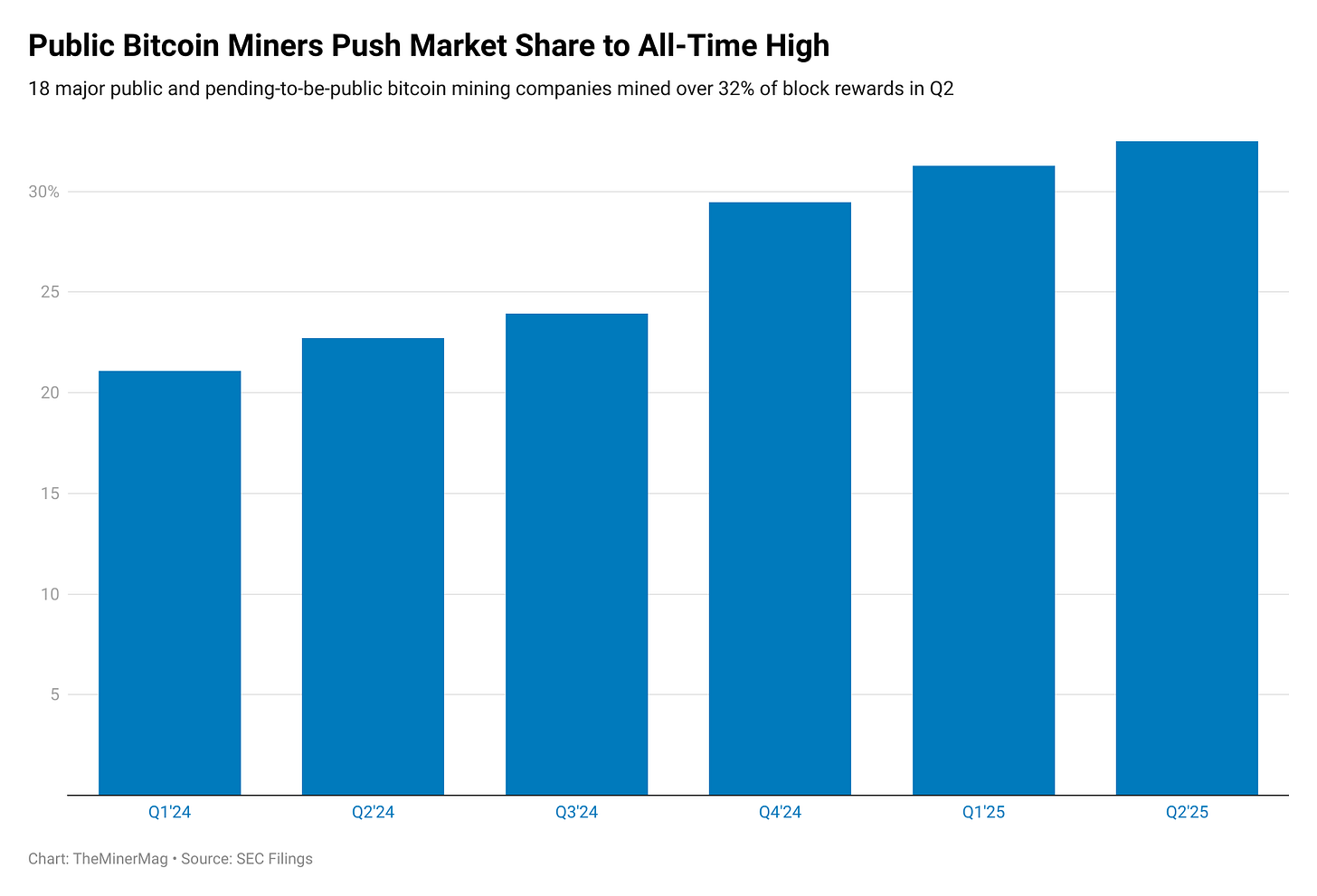 At the same time, newly reported Q2 production numbers reveal that public and soon-to-be-public miners are also quietly consolidating their share of bitcoin output. The combined market share of 18 companies increased to 32.5% in Q2, up from 21.1% the same period last year.