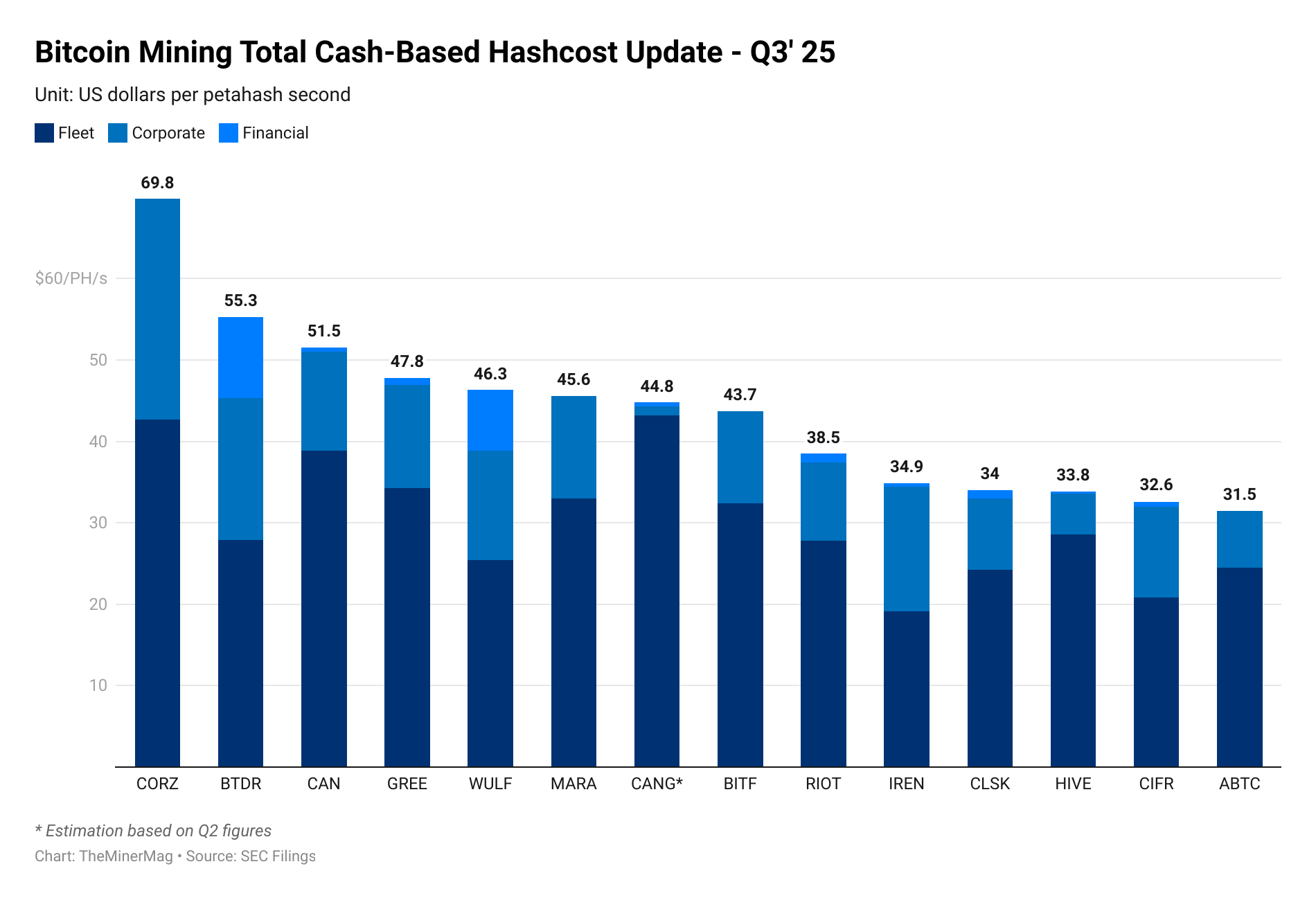 TheMinerMag’s recent Q3 look-back report makes this tension clear: the median total hashcost among major public miners sits around $44/PH/s. That number includes cash-based fleet opex, corporate overhead and financing—meaning even operators with efficient machines and competitive power rates are now navigating break-even economics. To account for diversified business models, corporate and financial hashcosts are estimated by allocating company-wide expenses proportionally based on the proprietary mining segment’s share of total revenue.